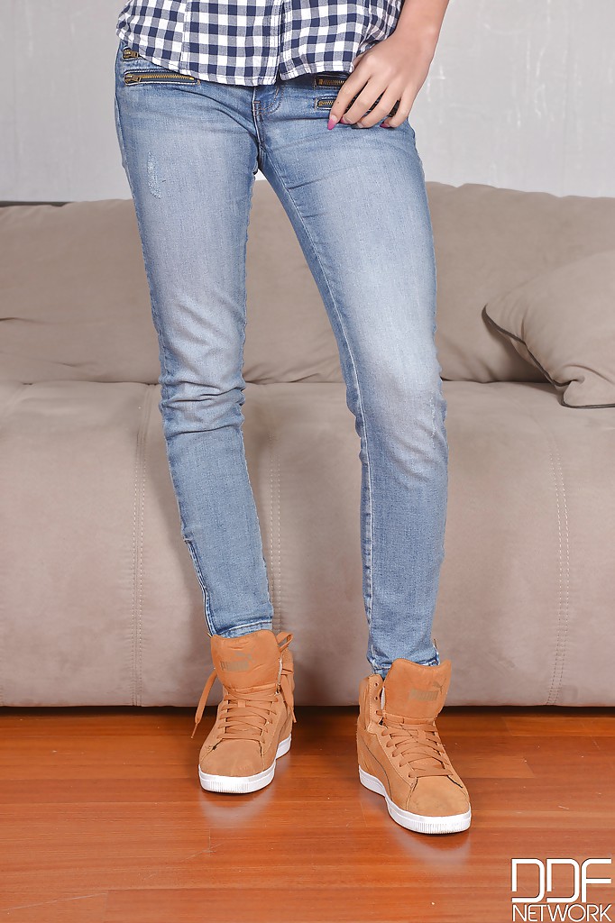 Длинноногая красотка принялась снимать джинсы, предварительно расстегнув клетчатую рубашку. Делала она это нарочито медленно, наблюдая за тем, как ведет себя бойфренд. На ногах у нее была нарисована татуировка, а интимная стрижка на лобке дополняла раскрепощенный образ. Девица легла на кровать и сомкнула ножки, демонстрируя фигуру, после чего перевернулась и начала мастурбировать.