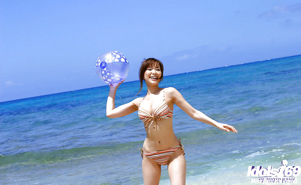 Веселая девица купается в море со своим избранником. Телочка плещется в приятной воде, кайфуя от своего отпуска. Туристка принялась играть в мячик с парнем и парочка немного возбудилась от своей игры и тогда они решили уединиться. Азиатка увела любовника в укромный уголок и сняла полосатый купальник. Когда волосатая киска была возбуждена, любовники захотели трахнуться.