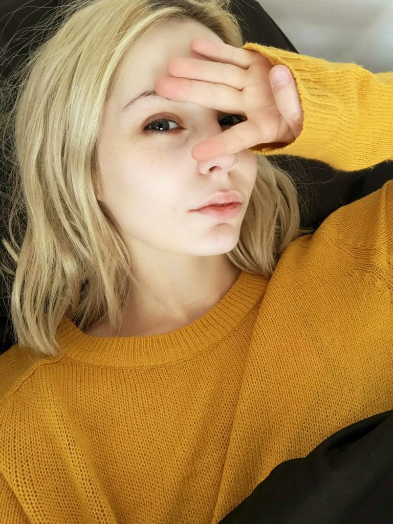 Молодая худышка с милым личиком делает дома эротические селфи. Блондинка показывает большие титьки в лифчике крупным планом и виляет маленькой попкой. Девушка позирует в нижнем белье или колготках, стесняясь оголять грудь или писечку.
