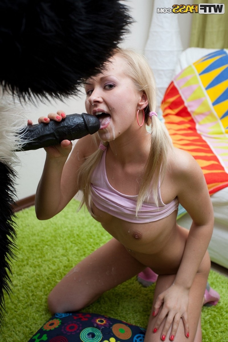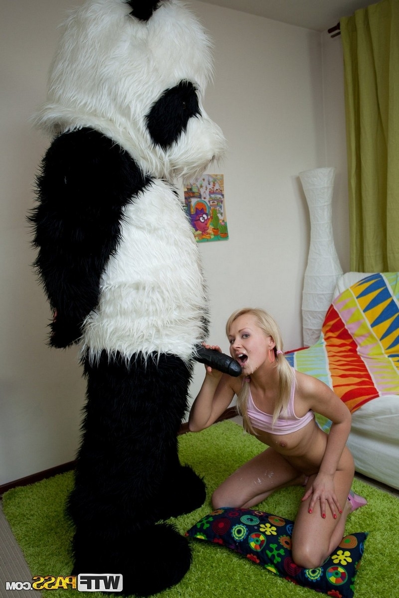 Миниатюрная соска забавляется со здоровый плюшевой пандой, к которой прикреплен самотык нехилых размеров. Мокрощёлка демонстративно берёт в ротик, показывая как хорошо она обучена минету и вставляет большой дилдо в свою разработанную щель, активно прыгая на нём.