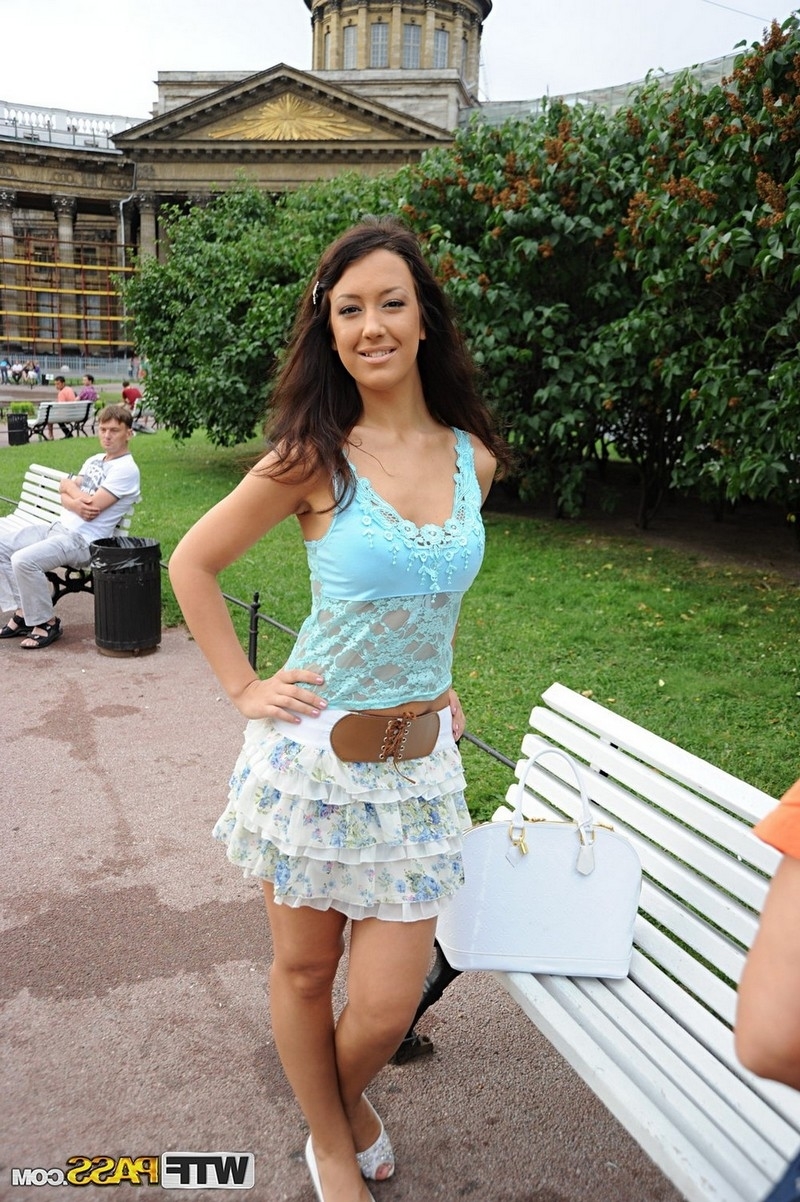 Стройная русская девица сверкает в городе своими прелестями, после чего направляется со своим спутником в более укромное место, где избавившись от одежды быстро поднимает его член ротиком и седлает его верхом, вставив конец в свою влажную письку. Но одной киски парню похоже было мало...