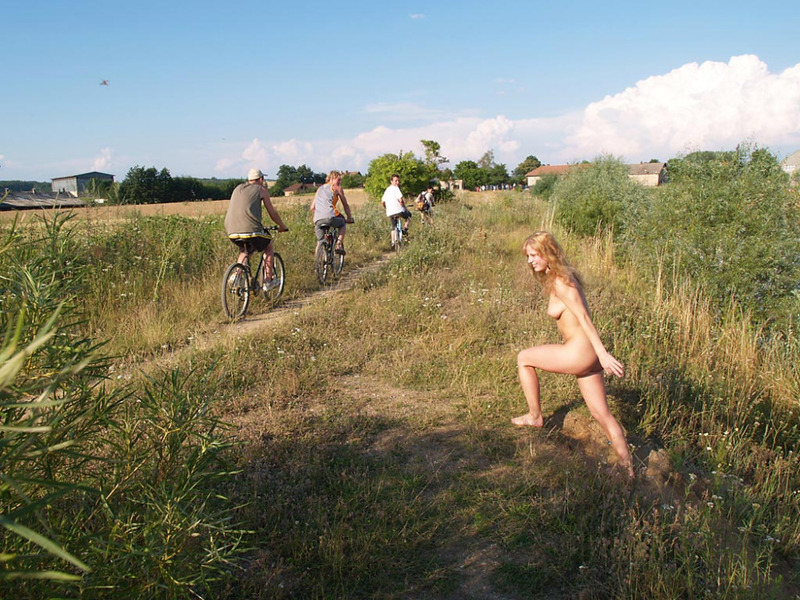 Компания велосипедистов проезжала по тропинке у озера и увидела, как из воды выходит только что искупавшаяся девушка. Парни сразу же обратили внимание на блондинку, ведь она была абсолютно обнаженной. Красавица сама подошла к велосипедистам, покрутив перед ними своей задницей и сиськами и давая возможность рассмотреть все свои прелести как можно более подробно.