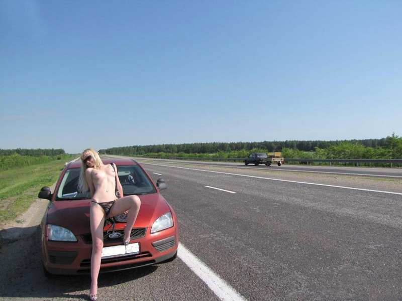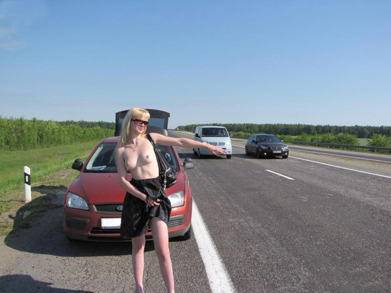Смышленая попутчица быстро догадалась, как привлечь внимание водителей и заставить их остановиться на обочине для быстрой поездки к месту назначения. Она попросту показала грудь проезжающим мимо машинам и все мужики немного притормозили у блондинки. Когда один из водителей подвез ее в город, девушка отблагодарила его горячим стриптизом прямо на улице.