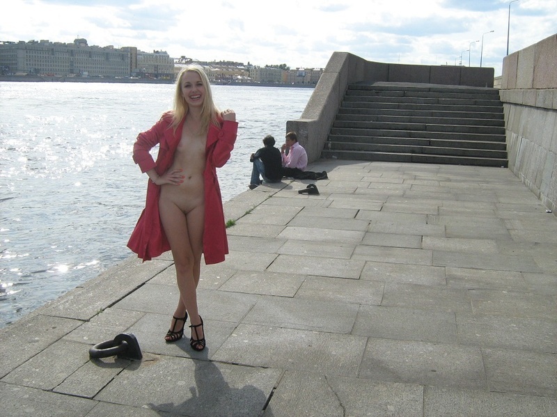Худощавая блондинка вышла на прогулку в одном плаще на голое тело. Она добралась до набережной, где предпочла полностью раздеться, чтобы попозировать в обнаженном виде на фоне реки и городских строений. Блонда ничуть не стеснялась похотливых взглядов мужчин, ведь их внимание ей только льстило. Она снова накинула плащ на плечи и вернулась домой, довольная после прогулки.