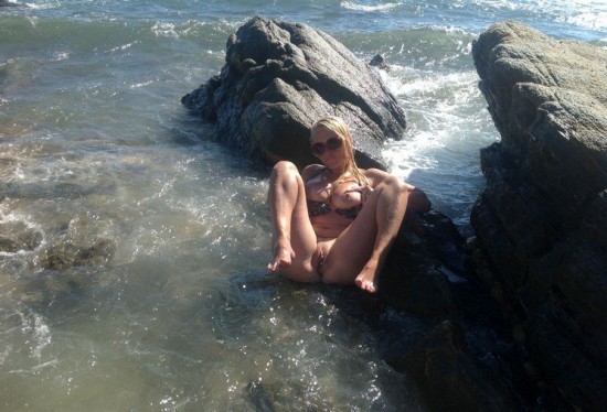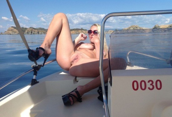 Блондинка начала откровенный фотосет на прибрежных камнях, где она стала раздеваться и демонстрировать свою великолепную грудь и кружевные трусики, после этого она перебралась на катер, который арендовал ее парень. Далее она раздвинула ножки, полностью оголилась и показала красивую промежность в различных позах, скрывая свои глазки под солнцезащитными очками.