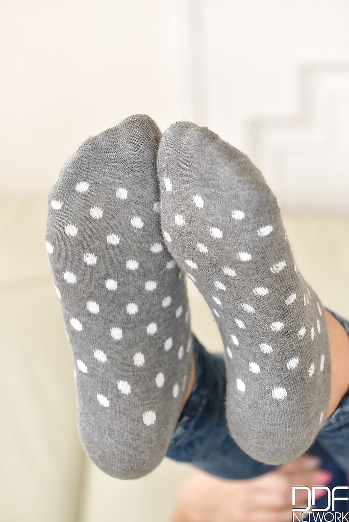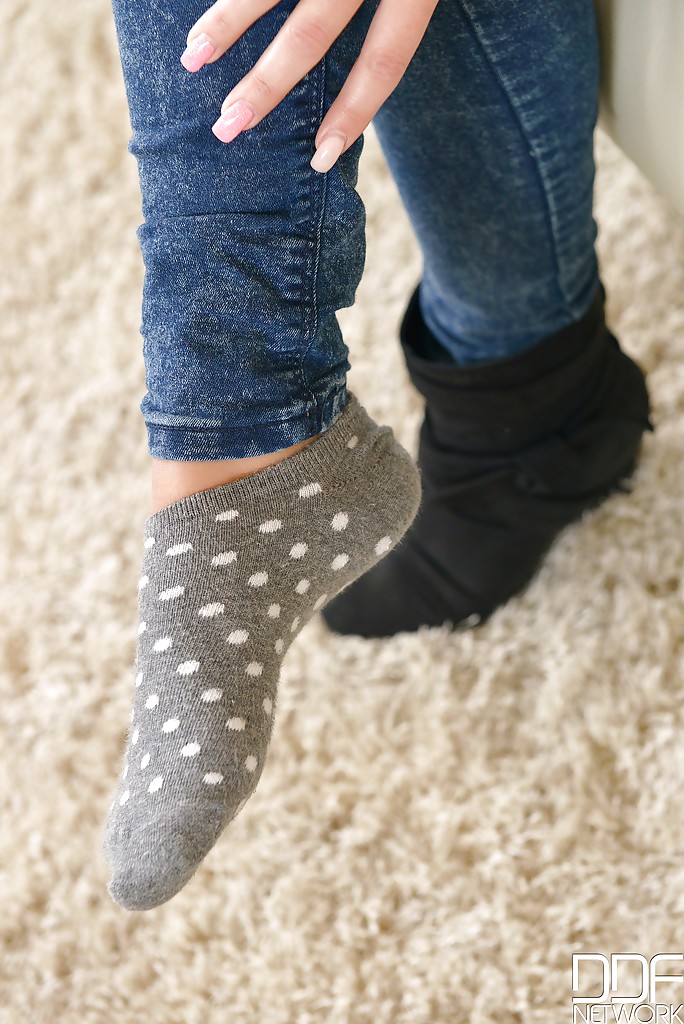 Сидя на светлом диване и задорно улыбаясь, рыжеволосая девушка с верхней частью тела оголенной по пояс, разувается и прижав колени к груди, демонстрирует на камеру свои стопы в носочках, а потом и без них. Сняв джинсы и трусики, шатенка вытягиваясь "солдатиком" показала свою стройность, расставив ляжки и раздвигая булочки попки ― заманчивость дырочек ануса и вагинки. Показ крупным планом ухоженных ступней и пальчиков ног, акцентировал внимание на их привлекательности.