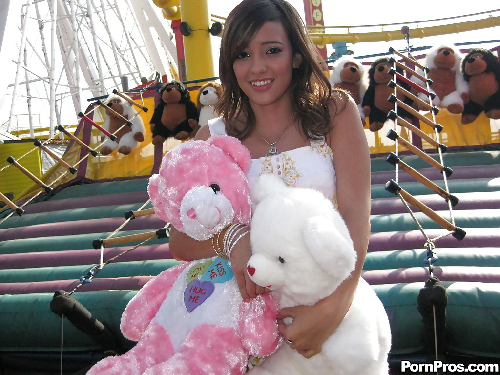 Бойфренд пригласил очаровательную барышню погулять в парк развлечений. Там они весело провели время за игровыми столиками, а парню даже удалось выиграть плюшевого медведя для своей спутницы. Придя домой, девица принялась раздеваться, надеясь поскорее принять душ, но перед этим полуголая милашка взяла в руки новую игрушку и улеглась на диван, чувствуя приятное тепло на груди.