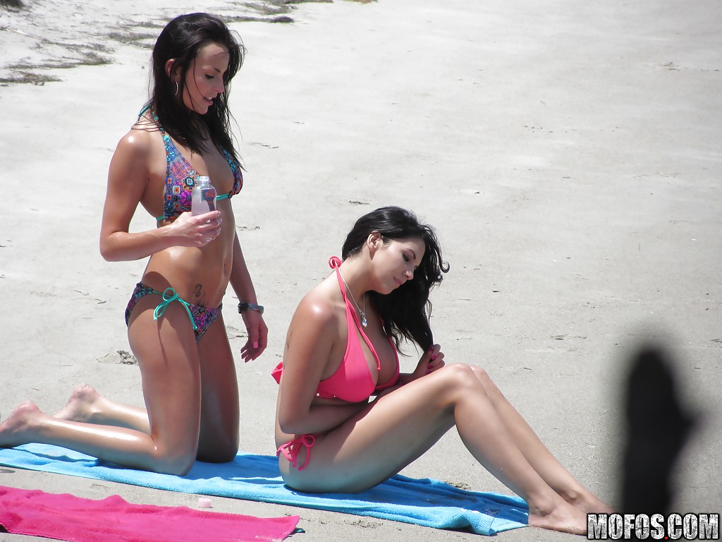 Поехав отдохнуть возле моря, две подружки собрали минимальное количество вещей и отправились в путь. Спустя пару часов они уже раскладывали полотенца на песке и смогли спокойно лечь позагорать. Солнце разморило их, и пассии решили позабавиться друг с другом. Не обращая внимания на людей вокруг, развратницы стянули лифчики, и стали шлепать себя по попкам, смеясь при этом на весь берег.